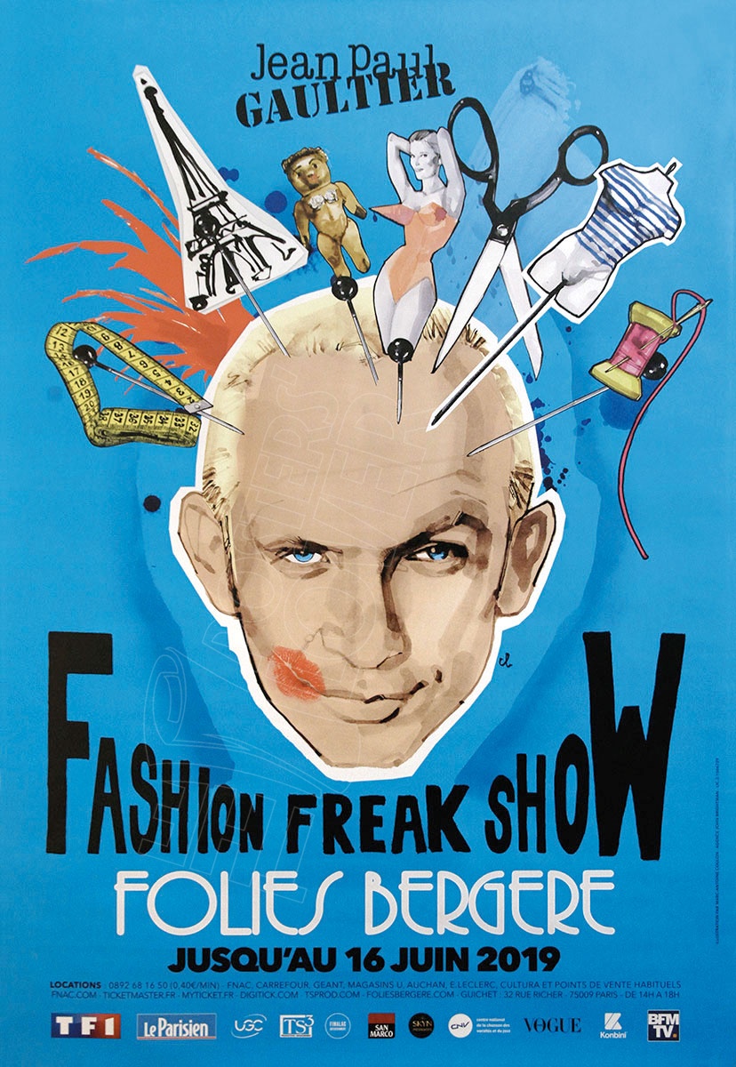 Superbe affiche promotionnelle pour la revue « Fashion Freak Show » signée Jean Paul Gaultier présenté sur la scène des Folies Bergère, à partir du 2 octobre 2018 au 16 juin 2019. La revue réunit des personnages délurés, excentriques, libres participant à un show démesuré pour des artistes à la hauteur de cette démesure.