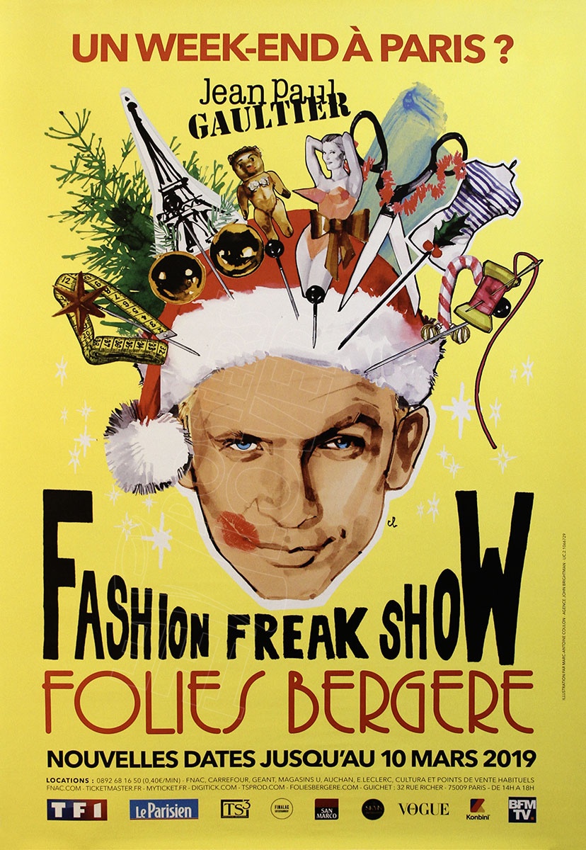 Superbe affiche promotionnelle pour la revue « Fashion Freak Show » signée Jean Paul Gaultier présenté sur la scène des Folies Bergère, à partir du 2 octobre 2018 au 16 juin 2019. La revue réunit des personnages délurés, excentriques, libres participant à un show démesuré pour des artistes à la hauteur de cette démesure.