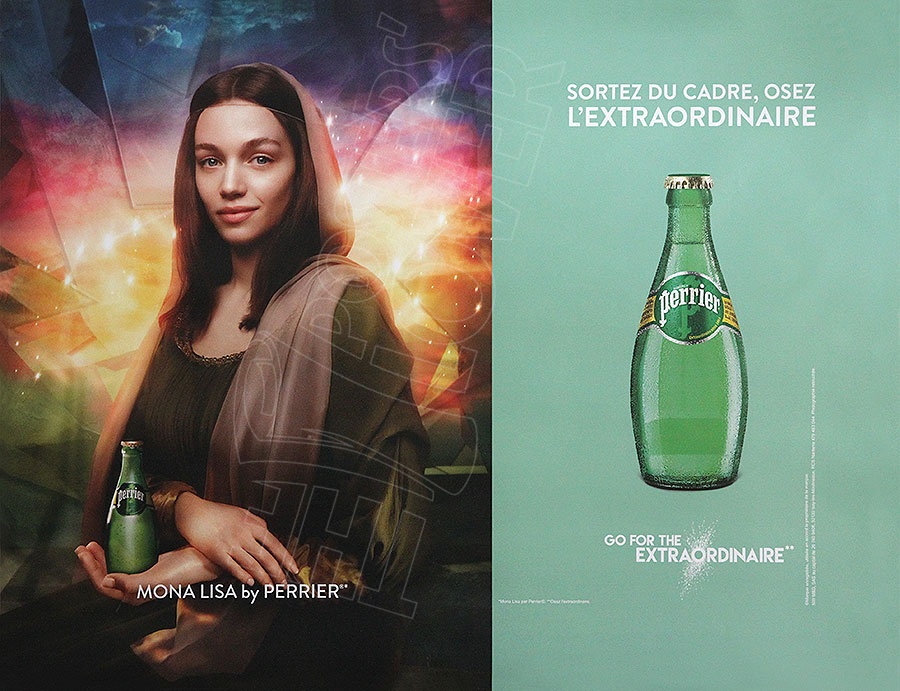 Mona Lisa sort de son cadre pour cette affichage de toute beauté dans le cadre d’une campagne Perrier, "Go for the extraordinaire" : "Osez l'Extraordinaire". Cette affiche Perrier modernise La Joconde et s'implante dans tout Paris.