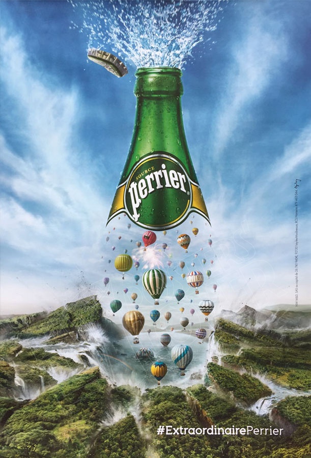Perrier et Ogilvy Paris ont fait pétiller cette affiche extraordinaire, mémorable, toute en couleurs en faisant des bulles de Perrier des montgolfières, baptisée "Hot Air Balloons".