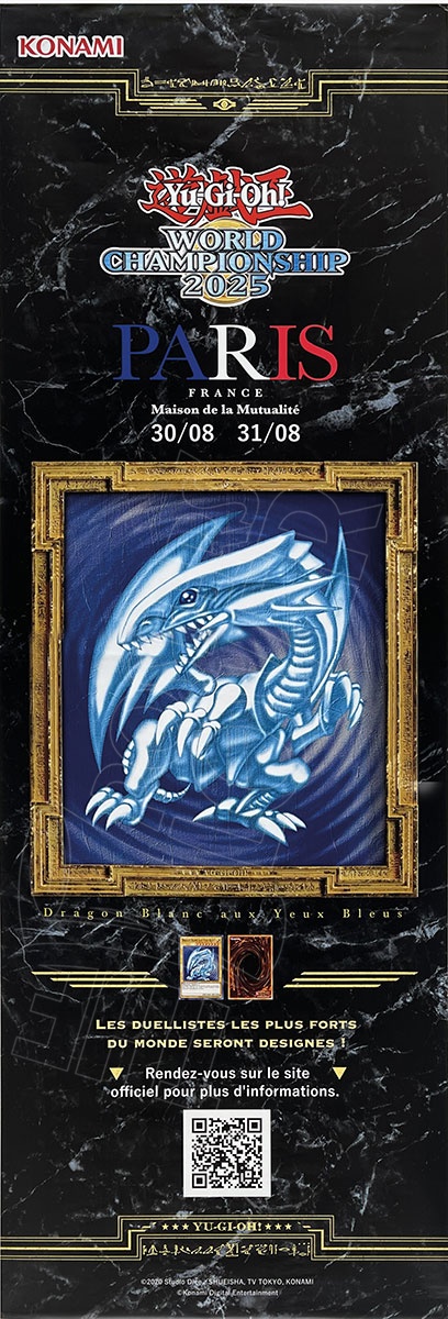 C’est l’heure du Duel ! avec cette affiche exceptionnelle (3 visuels différents : Magicien Sombre, Dragon Blanc aux yeux bleus & Exodia l'Interdit) pour la promotion du Championnat du monde Yu-Gi-Oh (WCS). C'est un tournoi qui détermine le 1er Duel au monde dans 4 catégories : Yu‑Gi‑Oh! TRADING CARD GAME, Yu‑Gi‑Oh! DUEL LINKS (SPEED DUEL format), Yu‑Gi‑Oh! DUEL LINKS (RUSH DUEL format) and Yu‑Gi‑Oh! MASTER DUEL.
