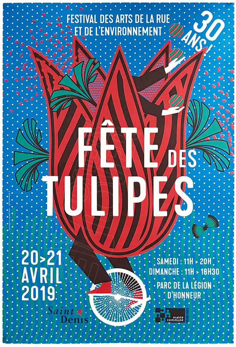 Très belle campagne d’affichage pour célébrer les 30 ans de la Fête des Tulipes de Saint-Denis les 20 et 21 avril 2019 au parc de la Légion d’Honneur. Plus de 100 spectacles et concerts de qualité, un village écologique, des artisans et restaurants du monde et plus de 75.000 tulipes sont au programme de cette édition exceptionnelle. L’événement est surtout l’occasion de spectacles d’arts de la rue, de concerts et d’animations pour les petits et grands.