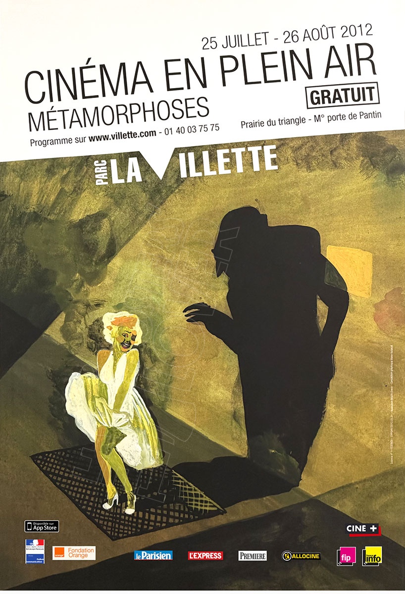 Affiche originale illustrée par Brecht Evens avec l'icône du cinéma Marilyn Monroe pour annoncer le cinéma en plein air du Parc de la Villette qui demeure l'endroit Parisien où s'aérer en soirée tout en se faisant une toile. Véritable institution, ce festival existe depuis 23 années déjà. De retour du 25 juillet au 26 août 2012, il offre l'occasion découvrir ou redécouvrir des films dans une ambiance conviviale et un cadre privilégié.