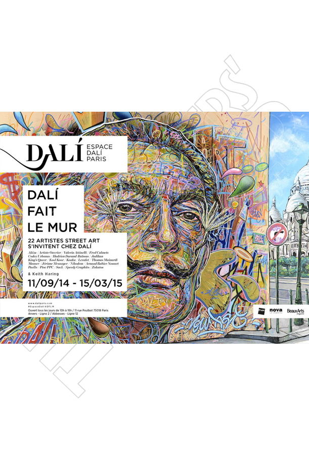 Affiche extraordinaire pour la promotion de l'événement "Dali fait le mur". Une exposition explosive, déconcertante, insolite, anticonformiste, populaire !!! 22 artistes urbains contemporains ont imaginé pour l’occasion leur rencontre avec le maître catalan du 11 sept. 2014 au 15 mars 2015.
