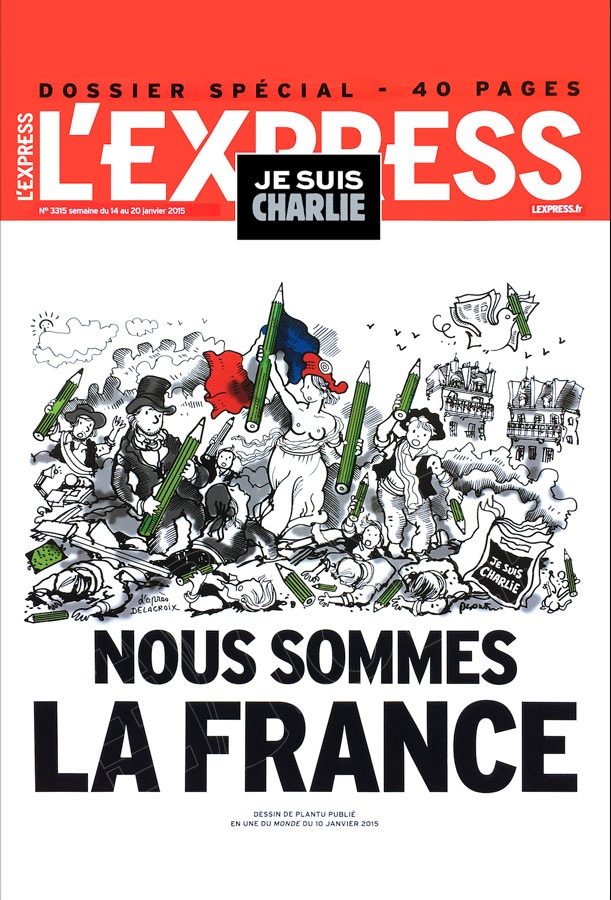 Superbe affiche dessinée par le célèbre dessinateur de presse et caricaturiste Plantu pour le magazine l'Express en soutien aux victimes de Charlie Hebdo reprenant le slogan "Nous sommes la France".