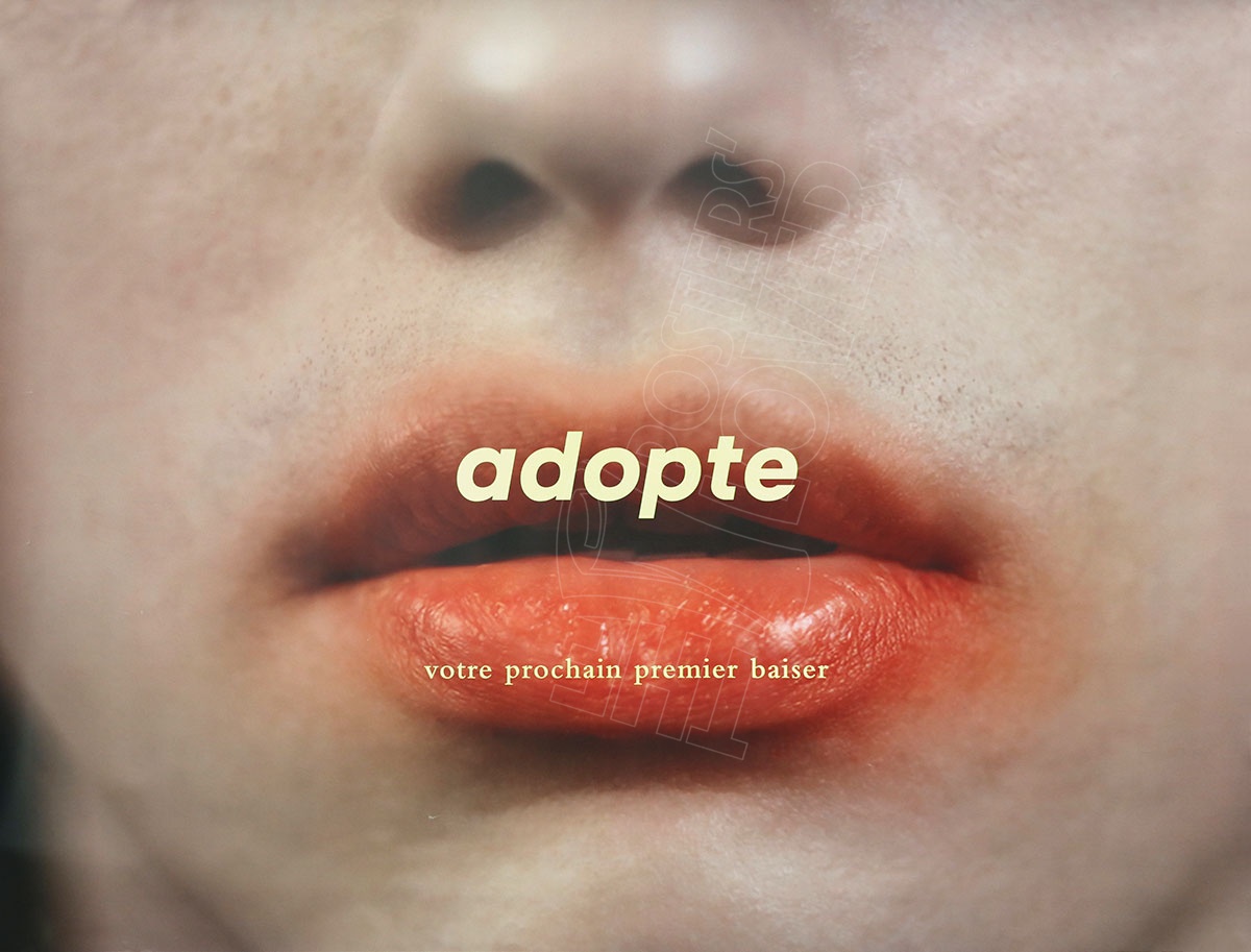 Affiche publicitaire originale de 2025 dont le thème est "Votre prochain premier baiser" avec deux visuels différents, un homme et une femme en gros plan dont notre regard s'oriente sur le logo et les lèvres. Pas de regard, pas de rencontre, une approche bien différentes de ce que la marque peut nous proposer habituellement en terme de marketing.