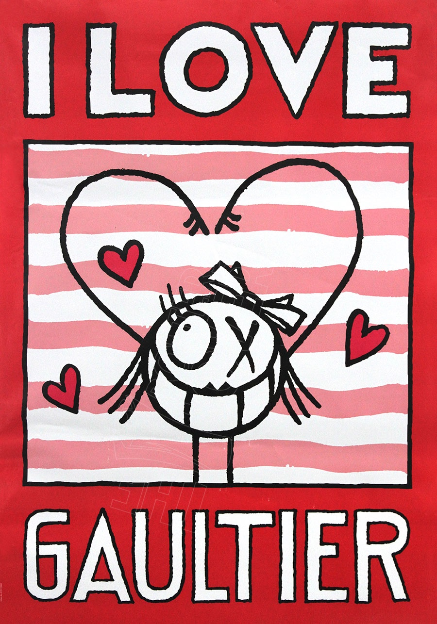 I Love Gaultier (Fond rouge), affiche originale dessin d'André Saraiva en collaboration avec Jean-Paul Gaultier