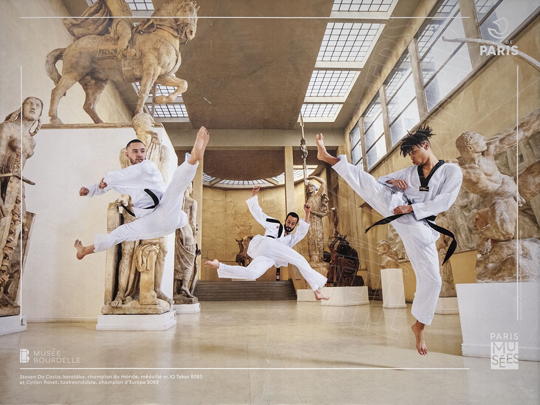 Paris Musées fête les Jeux avec une série de 8 affiches révélant les liens entre l’art, le sport et les musées de la Ville de Paris et une sélection de 8 expositions « arts et sports » dont les thématiques célèbrent les Jeux Olympiques et Paralympiques. Sur cette affiche pour le Musée Bourdelle on découvre Steven Da Costa, karatéka, champion du monde, médaillé OR JO de Tokyo 2020 et Cyrian Ravet, taekwondoïste, champion d'Europe 2022.