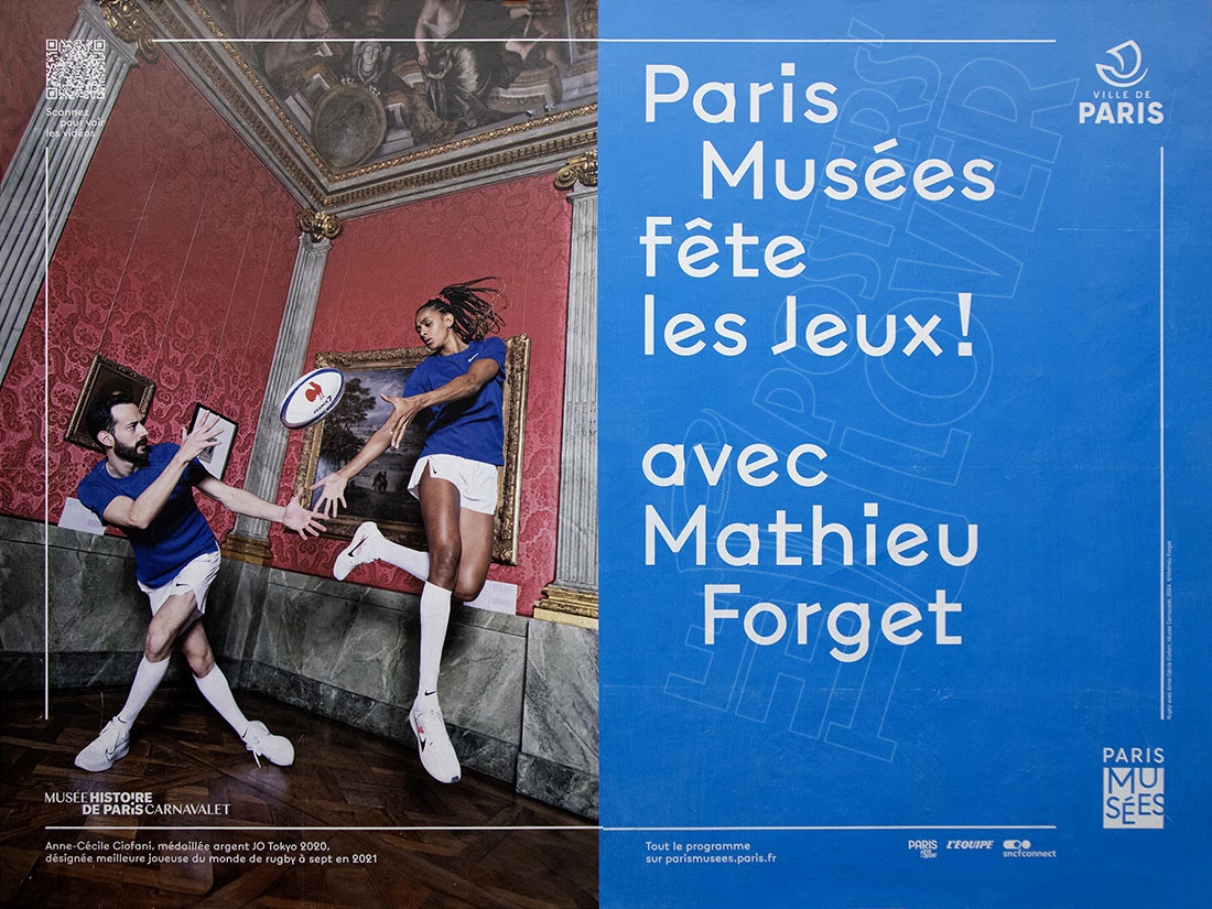 Paris Musées fête les Jeux avec une série de 8 affiches révélant les liens entre l’art, le sport et les musées de la Ville de Paris et une sélection de 8 expositions « arts et sports » dont les thématiques célèbrent les Jeux Olympiques et Paralympiques. Sur cette affiche pour le Musée Carnavalet met en situation Mathieu Forget & Anne-Cécile Ciofani, médaillée argent JO de Tokyo 2020, désignée meilleure joueuse du monde de rugby à sept en 2021.