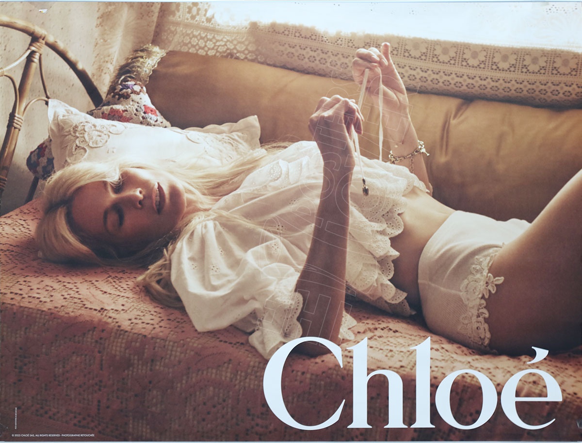 Très belle campagne d’affichage mettant en scène la célèbre mannequin Claudia Schiffer pour la marque Chloé et sa collection été 2025.Photographiée par David Sims, ces affiches déclinées en trois visuels (Assise, sur le dos et sur le ventre) sont dans ce format en édition très limitée (Rare). ... (Description complète plus bas)