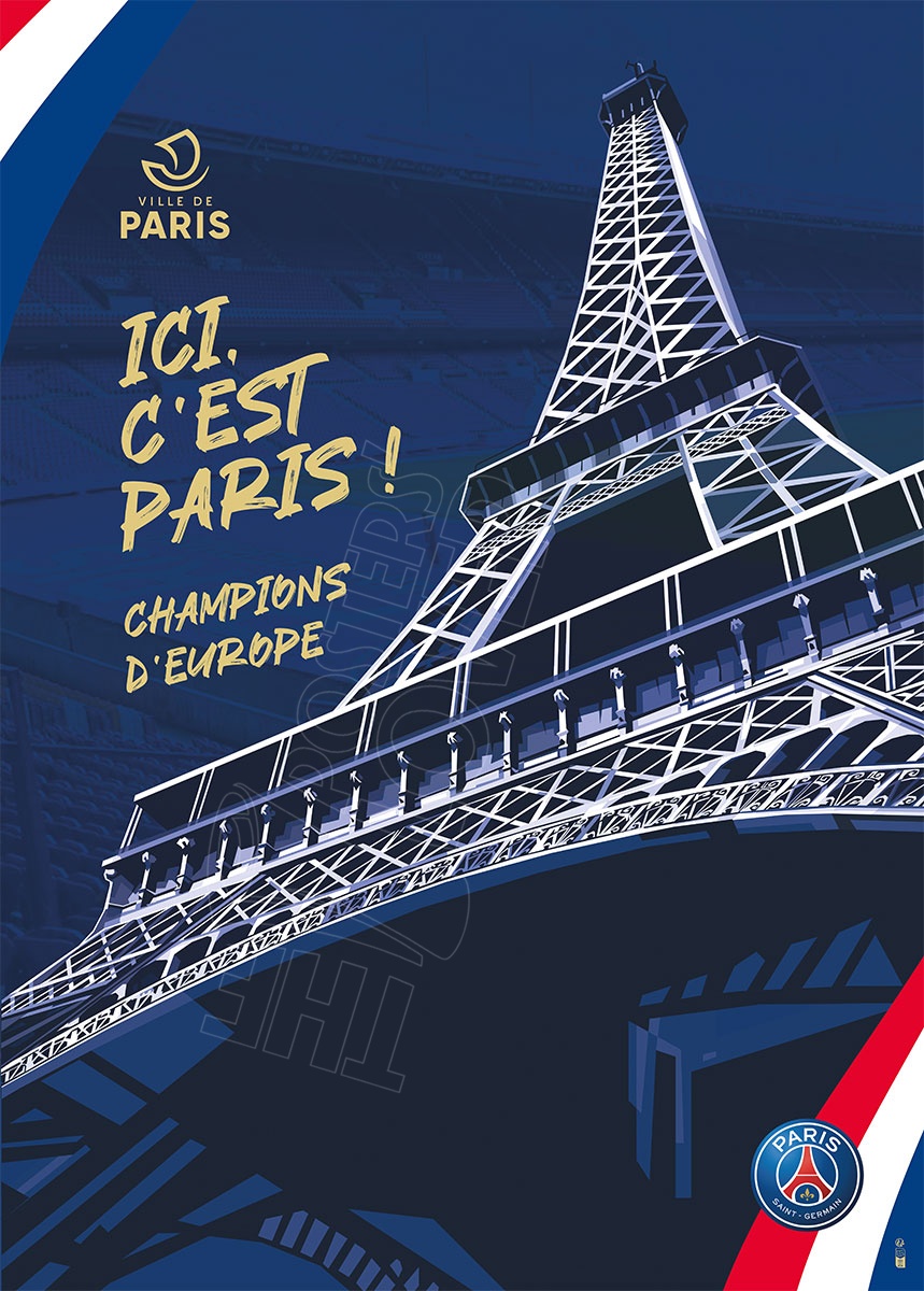 Série de 3 projets d'affiches originales non commercialisée pour la célébration de la victoire du PSG en tant que champion d'Europe 2025 "ICI C'EST PARIS". Les visuels mettent en scène le Parc des Princes, la Tout Eiffel et le Trophée.