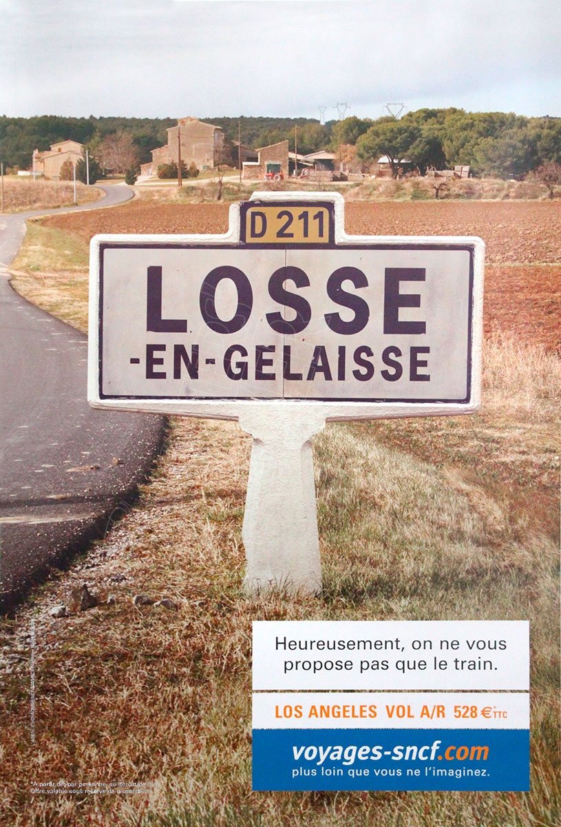 Très belle campagne d’affichage 2005 de l’agence DDB Paris et la SNCF qui ont fait preuve d’une imagination débordante, en détournant ainsi une quinzaine de «hauts-lieux» et mettant en scène des lieux imaginaires de bourgades françaises homophones de célèbres destinations internationales : « Nouillorc », « Losse-en-Gelaisse », « St-Gapour », « Quancoune », « Pétoches », « Gastreau-En-Thérite » ou encore « Dèche ».